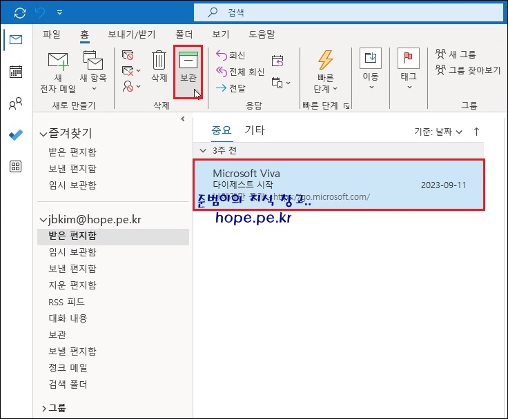 특정 메일을 클릭 후 '홈 리본 메뉴 > 삭제 그룹'에 '보관'을 클릭 하거나