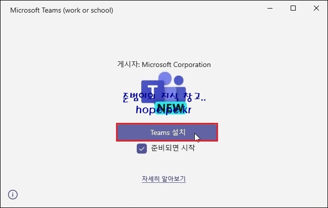 Microsoft Teams (work or school) 설치 창이 실행되면, 'Teams 설치' 를 클릭 합니다.