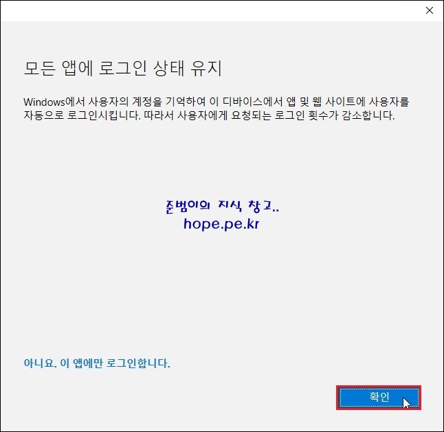 모든 앱에 로그인 상태 유지 창에서, '확인' 을 클릭 합니다.