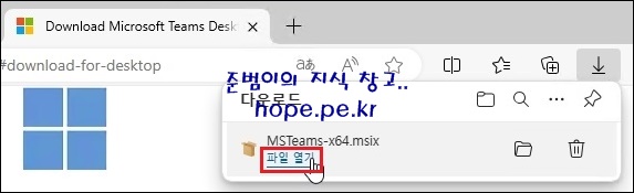 다운로드 한 'MSTeams-x64.msix 파일 열기' 를 클릭 합니다.