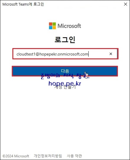 Microsoft Teams에 로그인 창에서, Teams를 사용할 수 있는 적법한 권한을 보유한 '계정' 입력 후 '다음' 을 클릭 합니다.