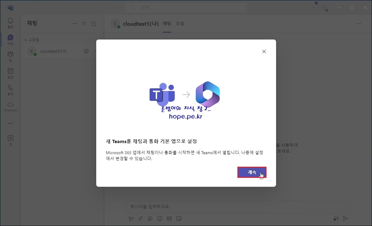 New Teams 에 정상적으로 로그인이 완료 되면, New Teams 사용을 위한 튜토리얼 창이 발생 합니다. '계속' 을 클릭하여 New Teams의 효율적인 사용을 위한 안내 사항을 확인합니다.