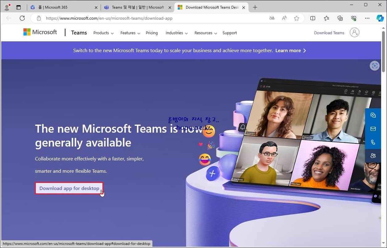 새 탭으로 Microsoft Teams를 다운로드 할 수 있는 사이트가 열리면, 'Download app for desktop' 을 클릭 합니다.