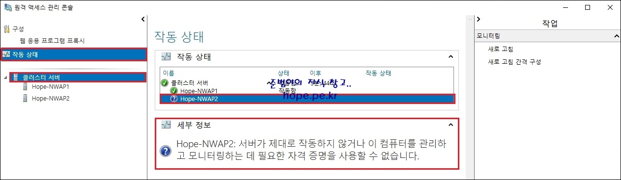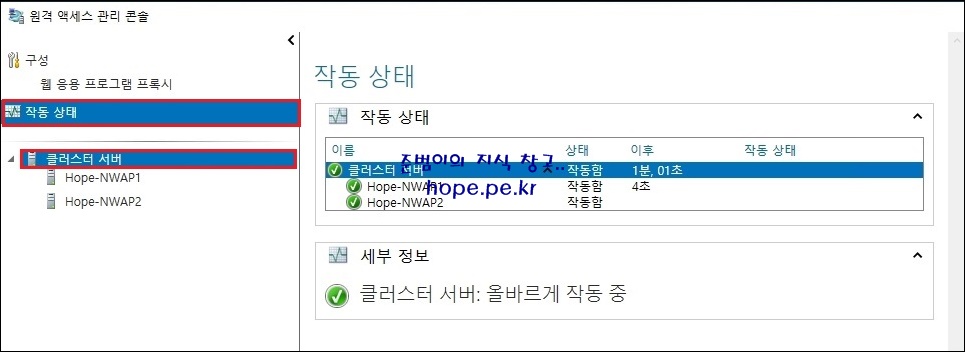 이제 원격 액세스 관리 콘솔을 닫았다가 재실행 후 '작동 상태' 를 확인해보면, 다음과 같이 다른 클러스터 서버의 상태가 '작동함'으로 정상적으로 표시 됩니다.