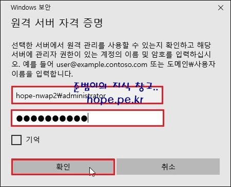 Windows 보안 원격 서버 자격 증명 창이 발생합니다. 해당 클러스터 서버의 '관리자 계정 정보' 를 올바르게 입력 후 '확인' 을 클릭하더라도