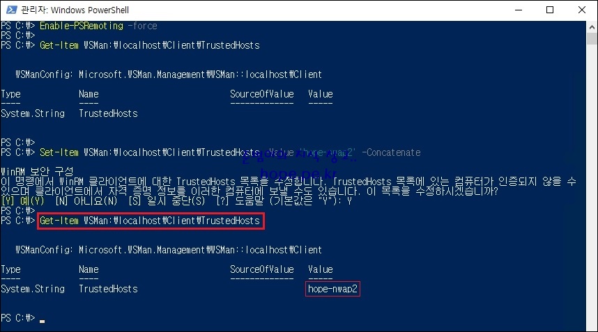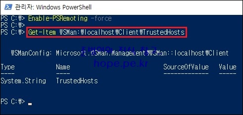다음 cmdlet 명령어를 실행하여 TrustedHosts 목록을 확인 합니다.