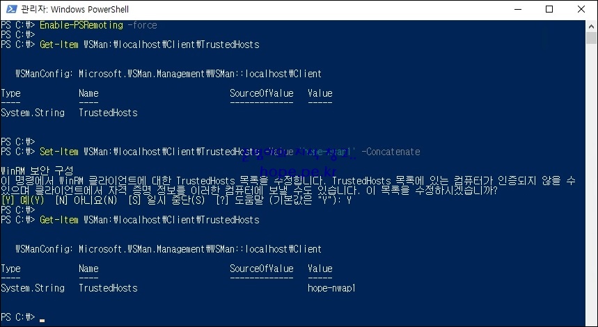 다음 cmdlet 명령어를 실행하여 TrustedHosts 목록을 확인 합니다.