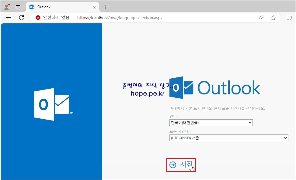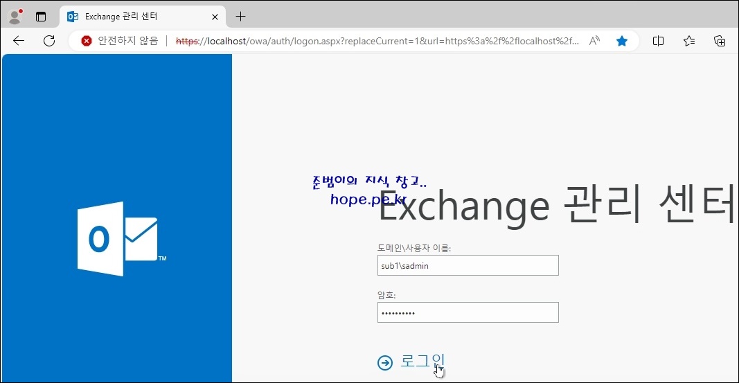 OWA 페이지 (https://localhost/owa) 에 접속 후 로그인을 진행 합니다.