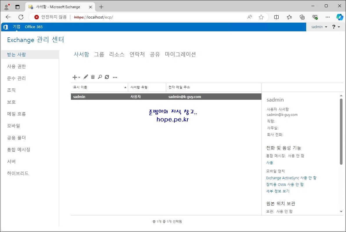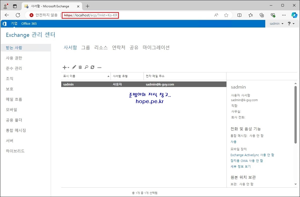 다시 Exchange 관리 센터에 접속해 보면 이제부터 정상적으로 한글로 표시가 됩니다. ^^