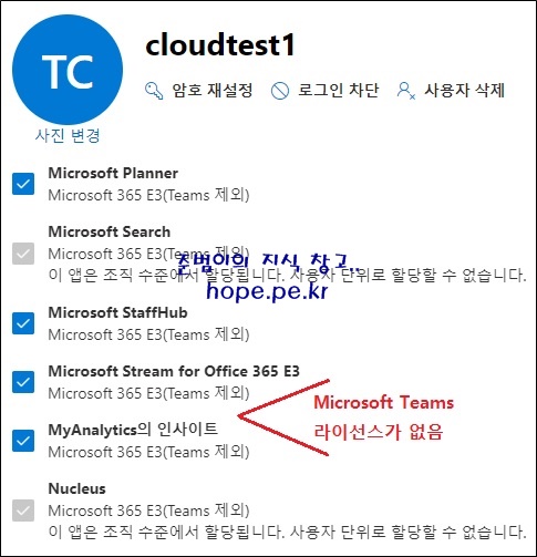 그리고 'Microsoft 365 E3(Teams 제외)' 세부 앱 목록을 확인해봐도 'Microsoft Teams' 라이선스가 표시되지 않습니다.