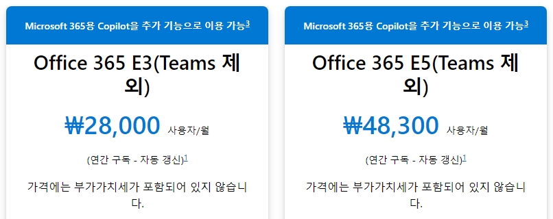 그리고 Microsoft 365 E3, E5 및 Office 365 E3, E5 라이선스는 다음과 같이 'Teams 제외' 로 표기가 된 라이선스를 구매해야 합니다.