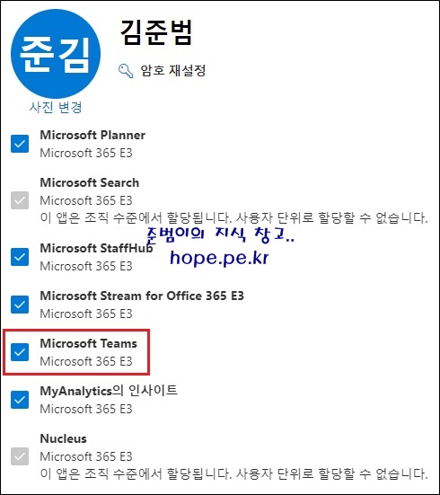 그리고 'Microsoft 365 E3' 세부 앱 목록을 확인해보면 'Microsoft Teams' 라이선스가 정상적으로 표시가 됩니다.