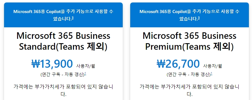 엔터프라이즈 고객과는 다르게 SMB(Small Medium Business)=중소기업 고객들은 Teams가 포함된 플랜과 Teams가 포함되지 않는 플랜을 구분해서 구매가 가능합니다.