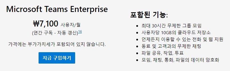 일반적으로 Microsoft 365 및 Office 365를 사용하기 위해서 엔터프라이즈 기업에서는 E3, E5 등의 라이선스를 구매하면 Teams가 포함되어 있었기에 그냥 사용하면 되었었습니다. 하지만 이제는 Teams가 제외되었기에 별도의 비용을 추가해서 Teams Enterprise 라이선스를 구매후 사용해야 합니다.