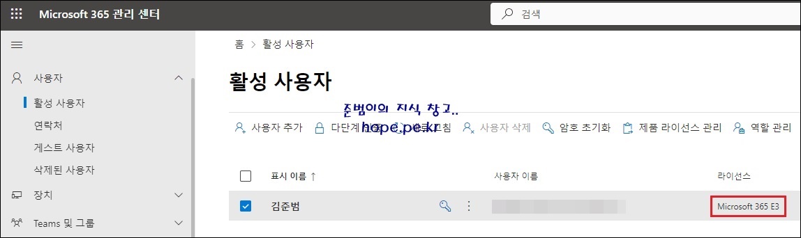 참고로 기존 고객들은 'Microsoft 365 관리 센터' 에서 사용자 라이선스를 확인해보면, 다음과 같이 이전과 동일하게 'Microsoft 365 E3' 로 표시가 됩니다.