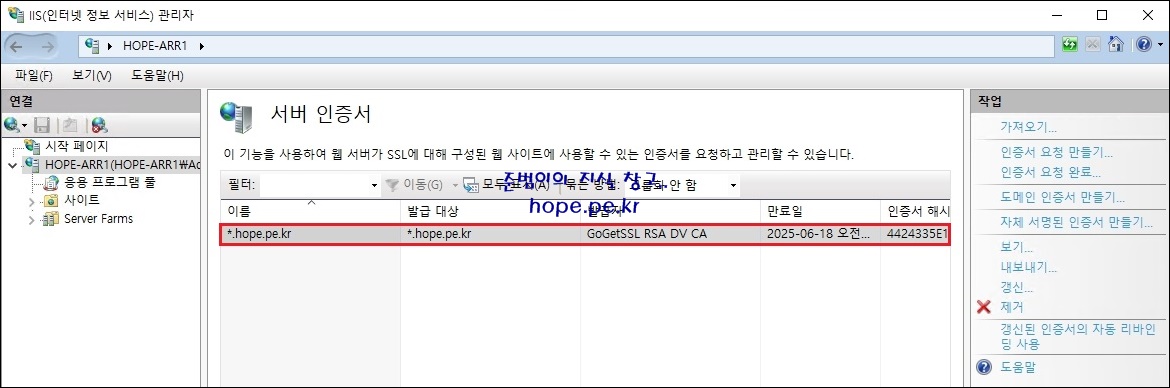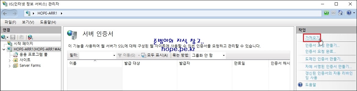 서버 인증서 화면의 우측 작업 패널에서, '가져오기' 를 클릭 합니다.