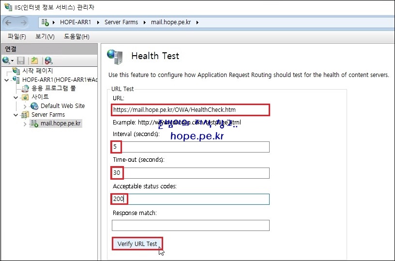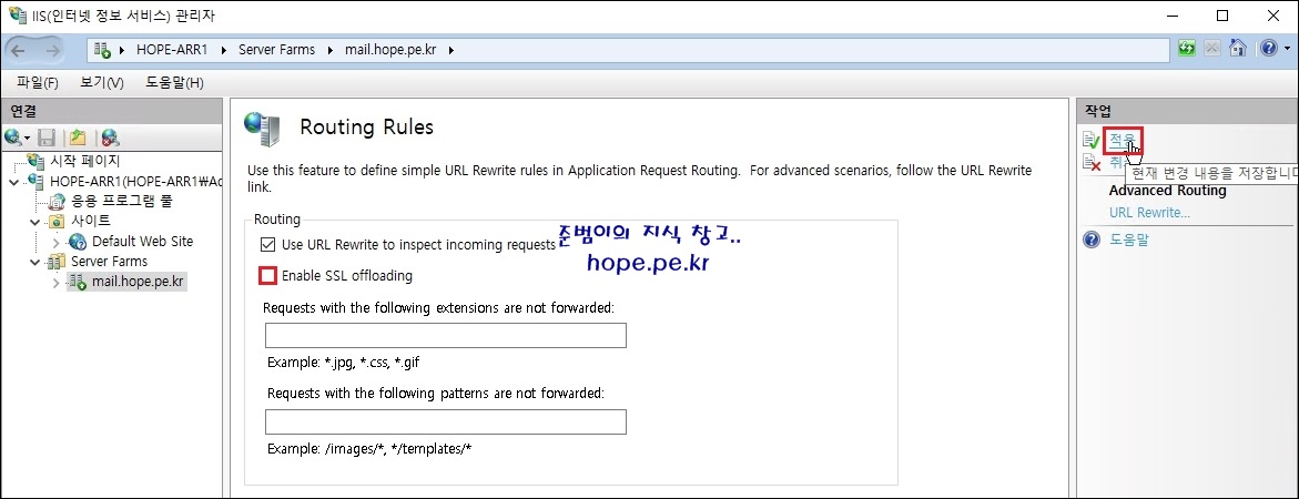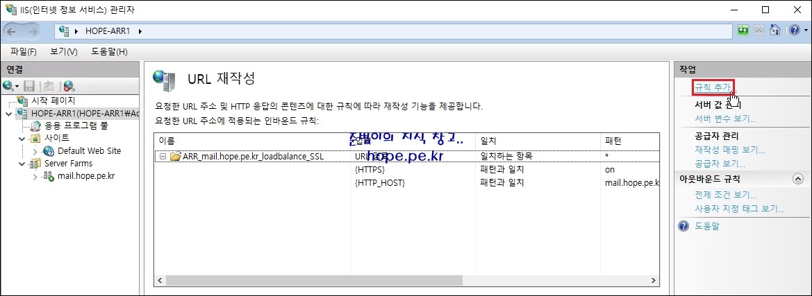 autodiscover URL (즉, ARR_autodiscover.hope.pe.kr_loadbalance_SSL) 에 대해 서버 팜과 URL 재작성 규칙을 만드는 동일한 단계를 반복합니다 .