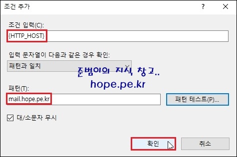 조건 추가 창에서, 조건 입력에 '{HTTP_HOST}' 입력 후 패턴에 '서버 팜 이름' 입력 후 '확인' 을 클릭 합니다.