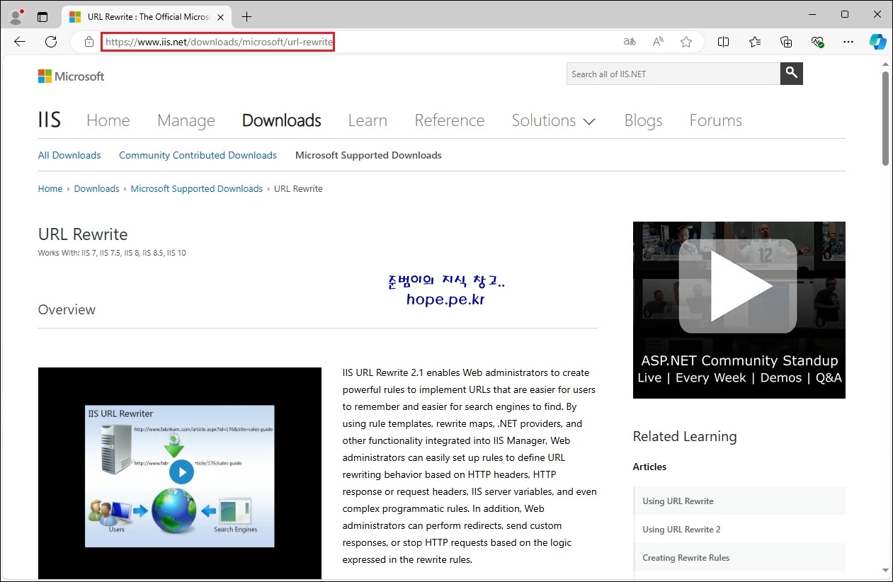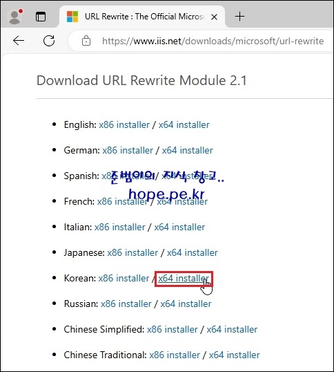 URL Rewrite 다운로드 사이트 (https://www.iis.net/downloads/microsoft/url-rewrite) 에 접속 합니다.