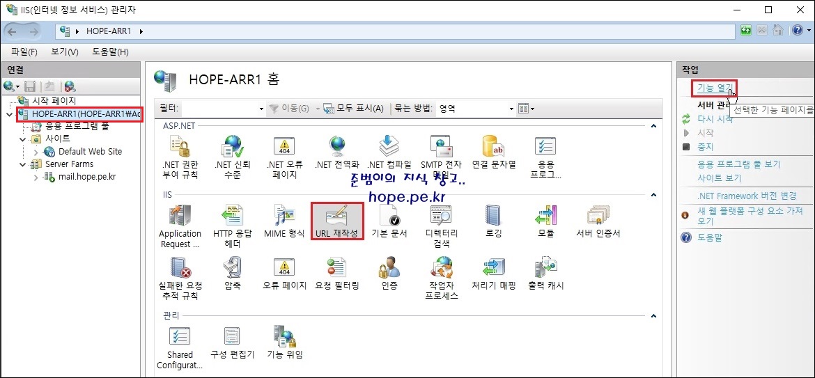 IIS ARR 서버 클릭 후 'URL 재작성' 클릭 후 우측 패널에서, '기능 열기' 를 클릭 합니다.