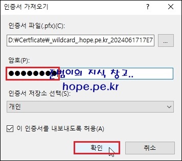 '암호' 입력 후 '확인' 을 클릭 합니다.
