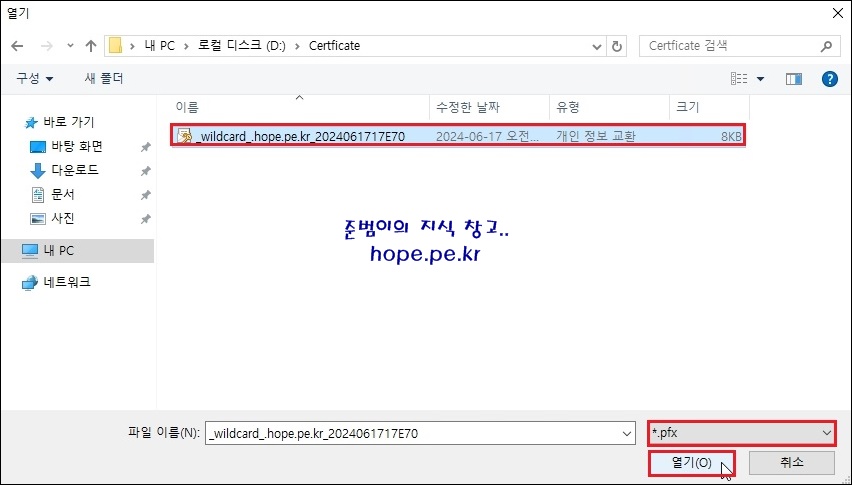 열기 창에서, 공인 인증서 선택 후 '열기' 를 클릭 합니다.