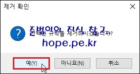 제거 확인 창에서, '예' 를 클릭 합니다.