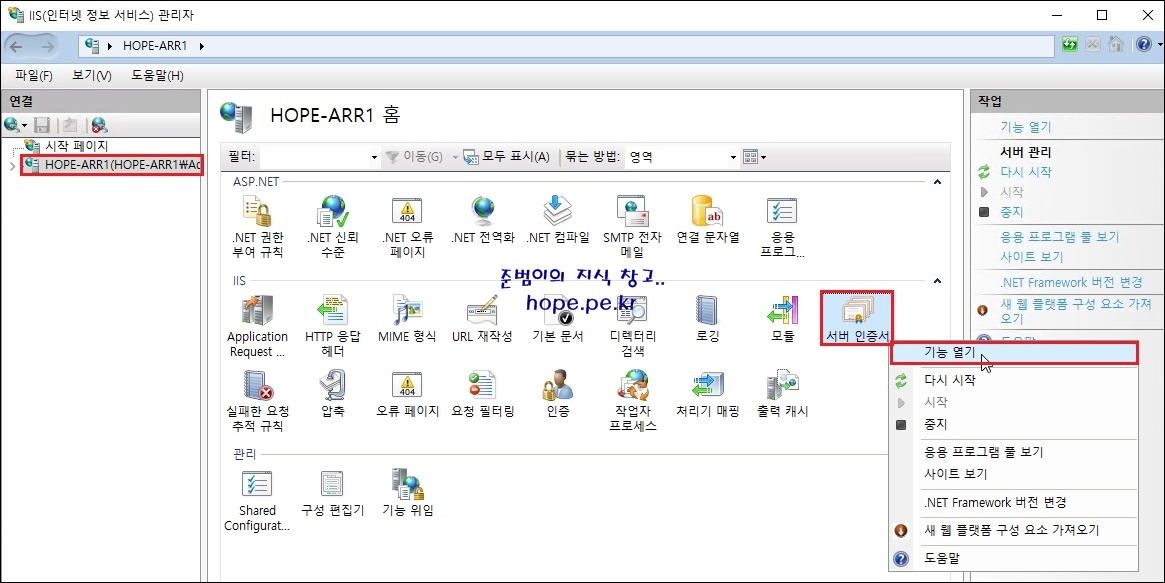 IIS (인터넷 정보 서비스) 관리자 콘솔이 실행되면, 'IIS ARR 서버 > 서버 인증서' 에서 우클릭 후 '기능 열기' 를 클릭 합니다.