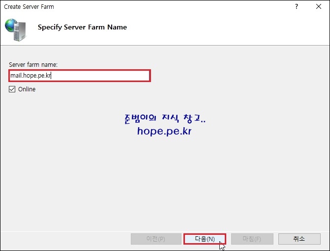 Create Server Farm 창에서, '서버 팜의 이름' 입력 후 '다음' 을 클릭 합니다.