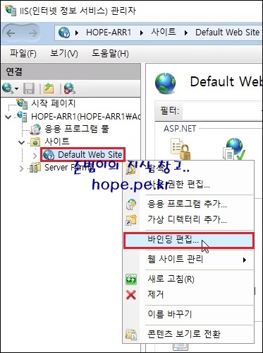 '사이트 > Default Web Site' 에서 우클릭 후 '바인딩 편집' 을 클릭 합니다.