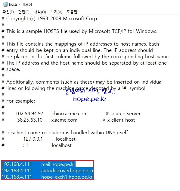 - IIS ARR 서버는 내부 Exchange 네임스페이스에 대한 이름 확인을 할 수 있어야 합니다. 만약 내부 DNS 서버를 사용하지 않는 경우 Host 파일을 편집해야 합니다.