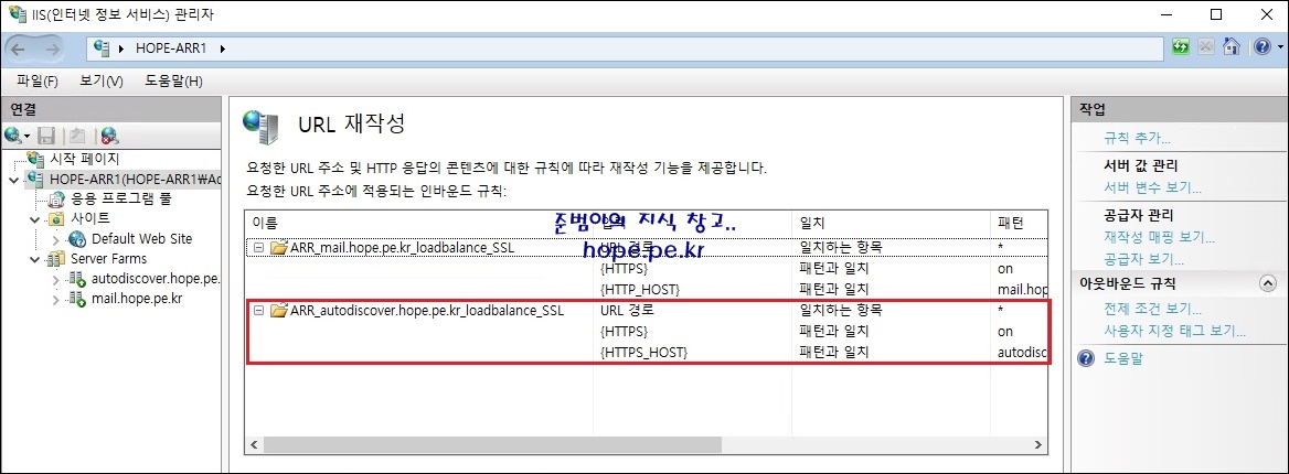 autodiscover URL (즉, ARR_autodiscover.hope.pe.kr_loadbalance_SSL) 에 대해 서버 팜과 URL 재작성 규칙을 만드는 동일한 단계를 반복합니다 .