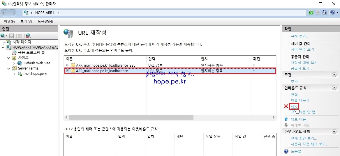'ARR_서버 팜 이름_loadbalance' 클릭 후 '제거' 를 클릭 합니다. cf) HTTP 규칙을 제거 합니다.