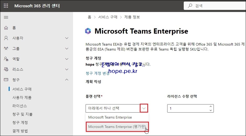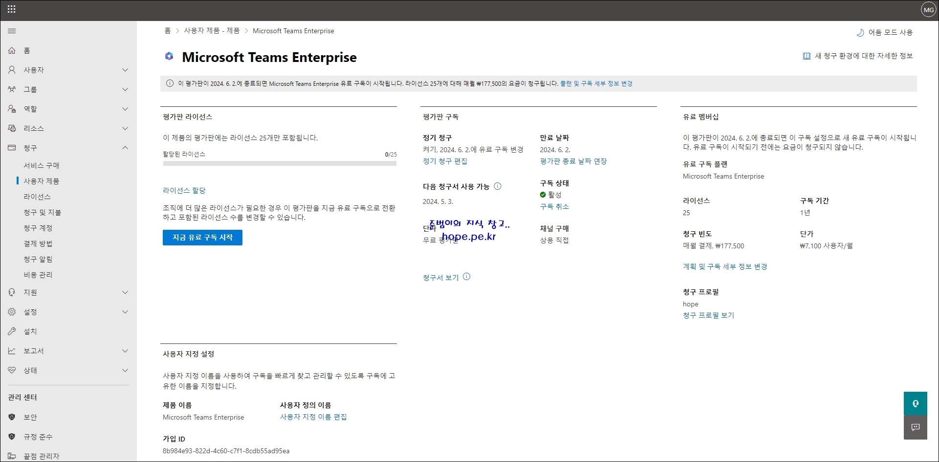 일정 시간 후 페이지를 새로 고치면 다음 화면과 같이 Microsoft Teams Enterprise 평가판 구독 페이지가 정상적으로 표시 됩니다.