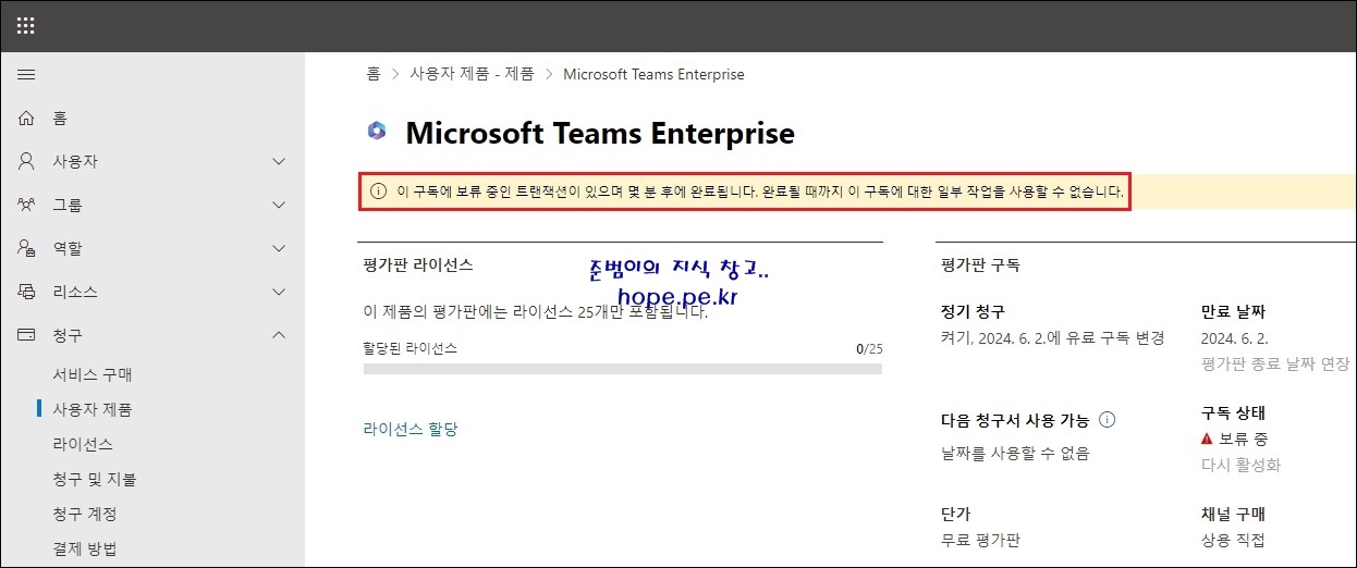 평가판 구독 직후 Microsoft Teams Enterprise 제품 화면에 '이 구독이 보류 중인 트랜잭션이 있으며 몇 분 후에 완료됩니다. 완료할 때까지 이 구독에 대한 일부 작업을 사용할 수 없습니다.' 메세지가 표시 됩니다.