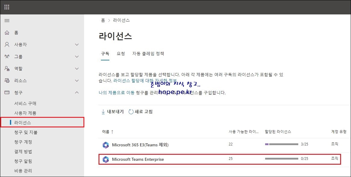 그리고 라이선스 페이에서도 'Microsoft Teams Enterprise' 라이선스가 등록되어있음을 확인할 수 있습니다.