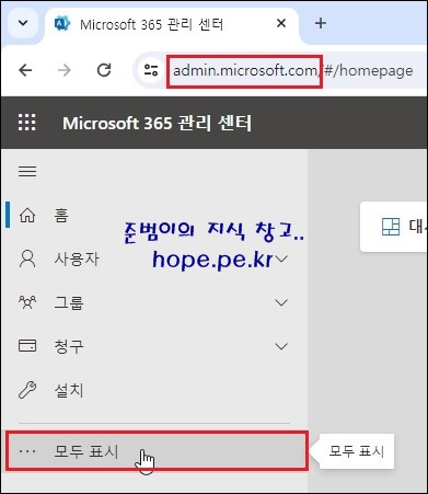 웹브라우저에서 'Microsoft 365 괸리 센터(https://admin.microsoft.com)' 에 접속 후 '모두 표시' 를 클릭 합니다.