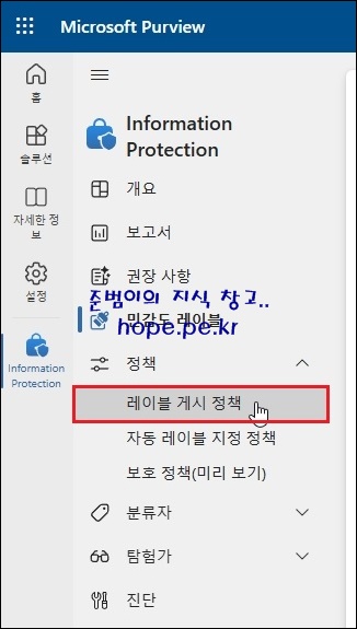 Information Protection 메뉴에서, '민감도 레이블' 을 클릭 합니다.