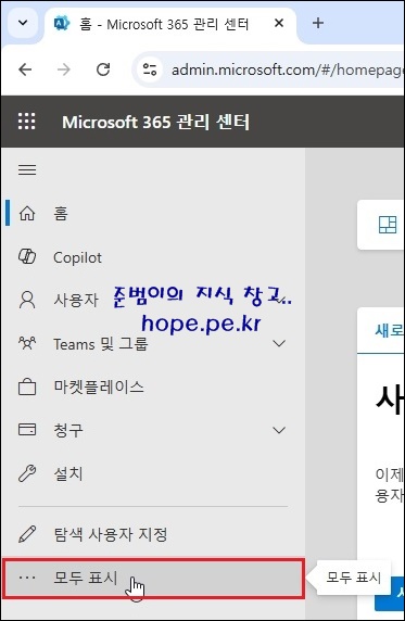 'Microsoft 365 관리 센터 (https://admin.microsoft.com)' 접속 후 왼쪽 메뉴에서 '모두 표시' 를 클릭 합니다.
