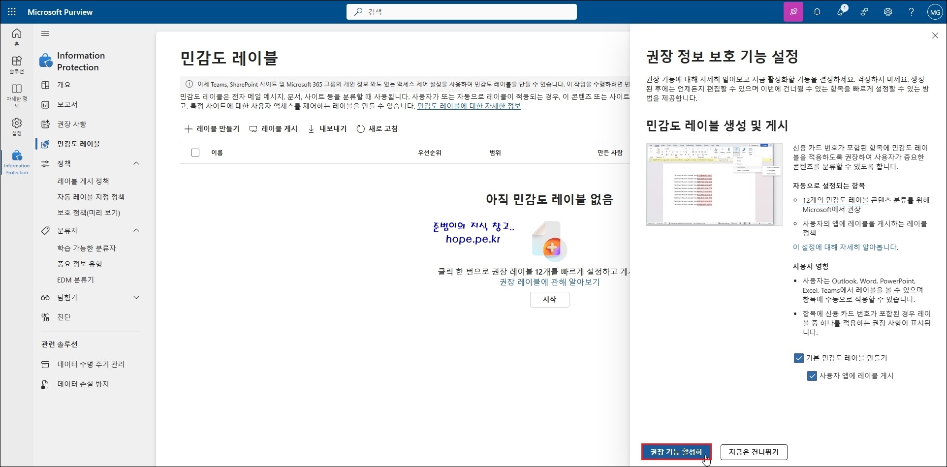 Microsoft는 Information Protection 사용이 익숙하지 않은 신규 고객 및 아직 Information Protection 설정을 진행하지 않은 기존 고객을 위해, 단 한번의 클릭만으로 권장 레이블 12개를 생성하고 레이블 정책을 빠르게 게시하는 방법을 제공하고 있습니다.