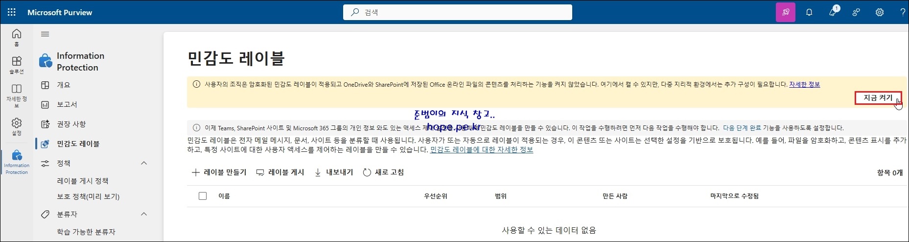 민감도 레이블 화면이 아래 스샷과 같은 메세지가 나온다면 '지금 켜기' 를 클릭 합니다.