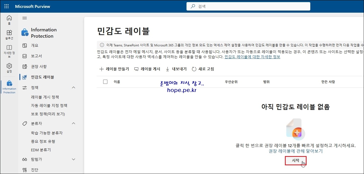 '아직 민감도 레이블 없음' 메세지가 표시됩니다. '시작' 을 클릭 합니다.