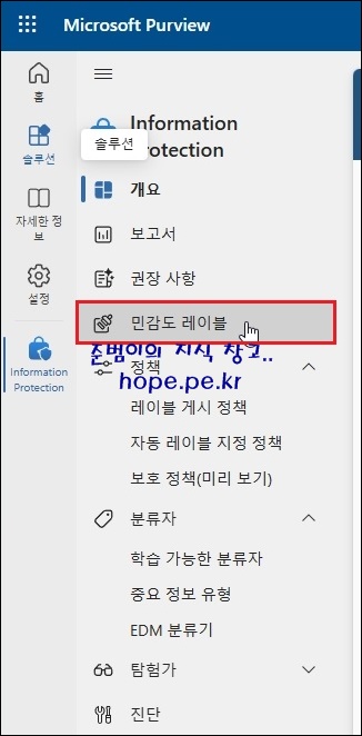 Information Protection 메뉴에서, '민감도 레이블' 을 클릭 합니다.