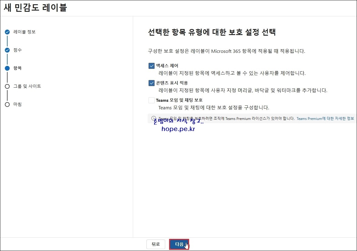 새 민감도 레이블 > 항목 > 선택한 항목 유형에 대한 보호 설정 선택 화면에서, 레이블 범위를 정의한 항목 유형에 대한 보호 설정을 선택 후 '다음' 을 클릭 합니다.