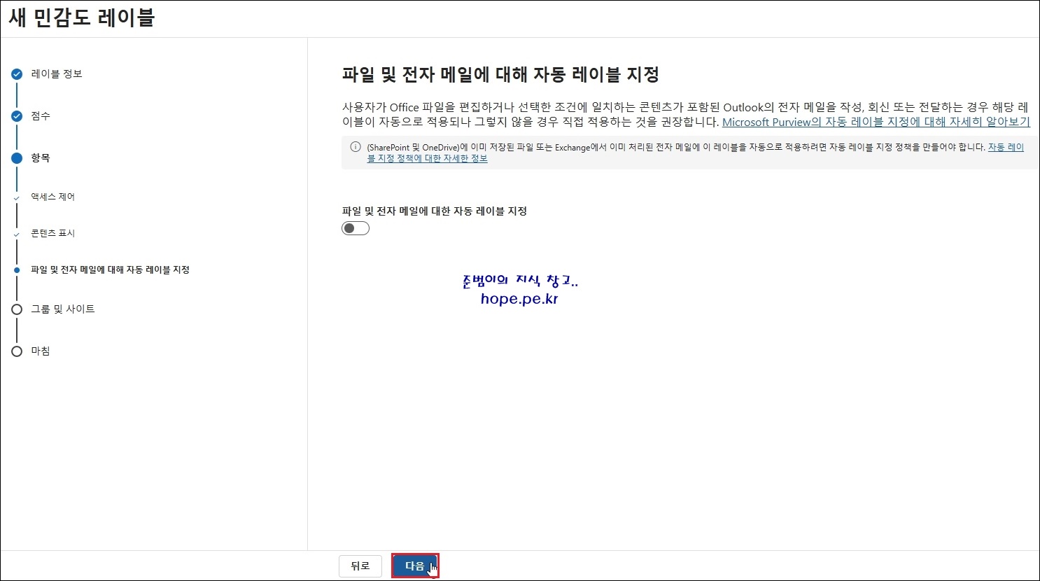 새 민감도 레이블 > 항목 > 파일 및 전자 메일에 대해 자동 레이블 지정 화면에서, '다음' 을 클릭 합니다.