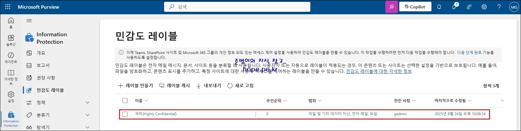 민감도 레이블 화면에서, 생성한 민감도 레이블을 확인 합니다.