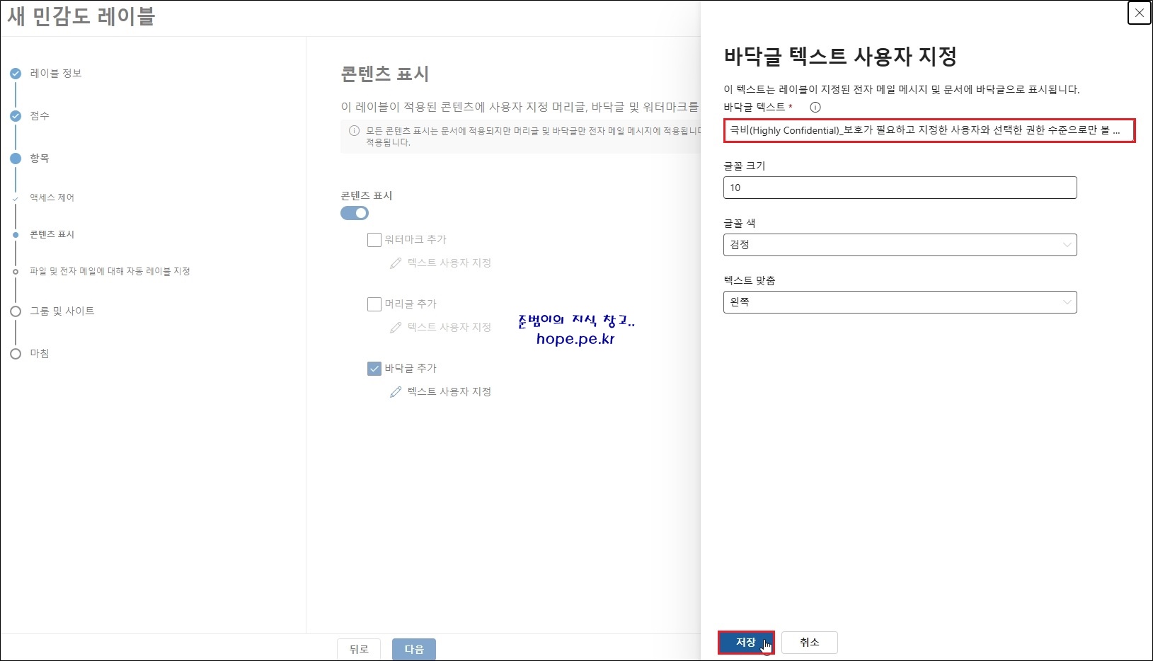 (본 포스팅에서는 바닥글 텍스트는 '극비(Highly Confidential)_보호가 필요하고 지정한 사용자와 선택한 권한 수준으로만 볼 수 있는 극비 데이터' 로 입력 하였고, 나머지는 기본값을 사용 하였습니다.)