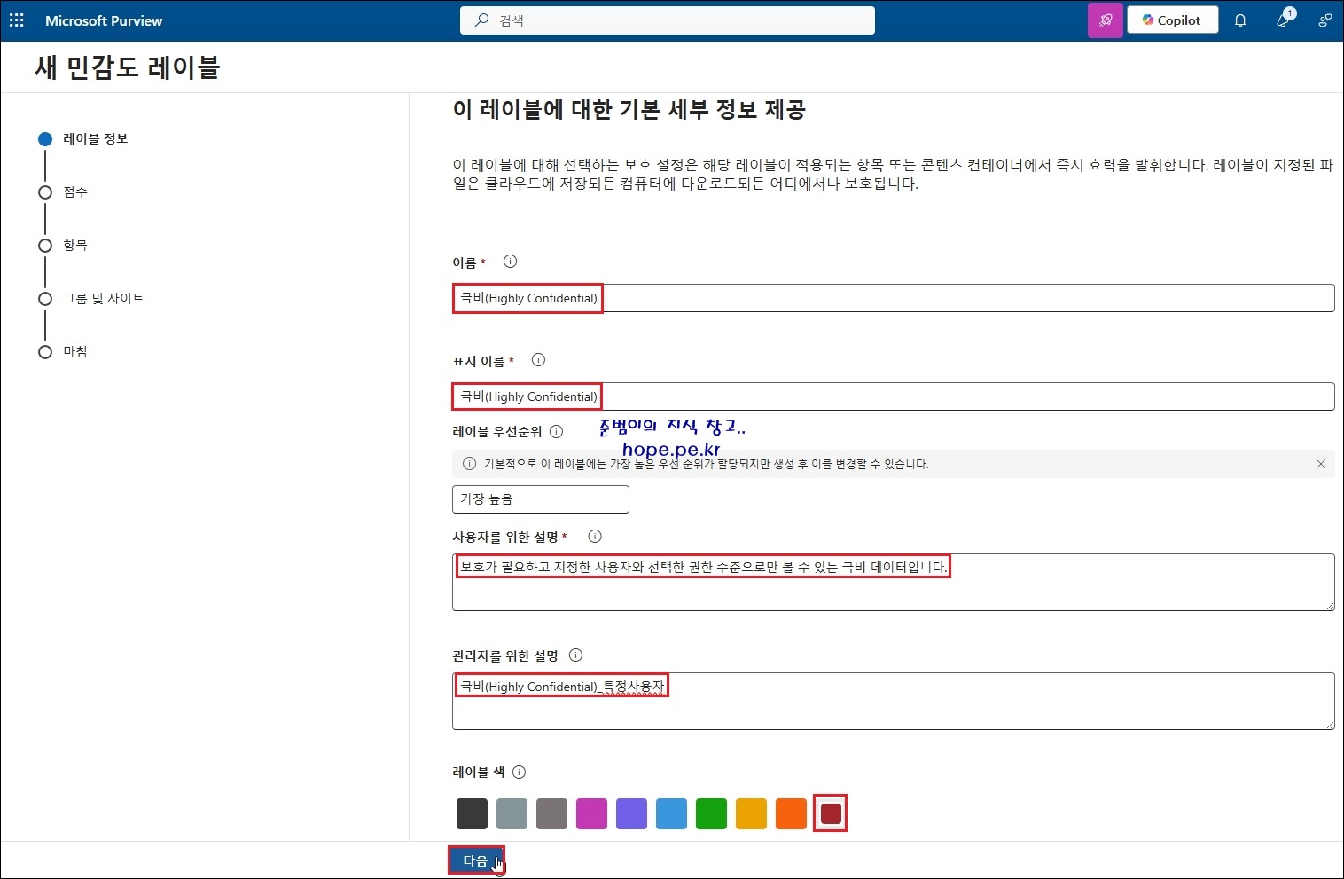 새 민감도 레이블 > 레이블 정보 화면에서, 다음 항목을 입력 및 선택 후 '다음' 을 클릭 합니다.