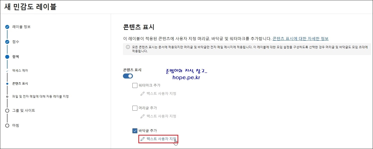 (본 포스팅에서는 바닥글 텍스트는 '극비(Highly Confidential)_보호가 필요하고 지정한 사용자와 선택한 권한 수준으로만 볼 수 있는 극비 데이터' 로 입력 하였고, 나머지는 기본값을 사용 하였습니다.)