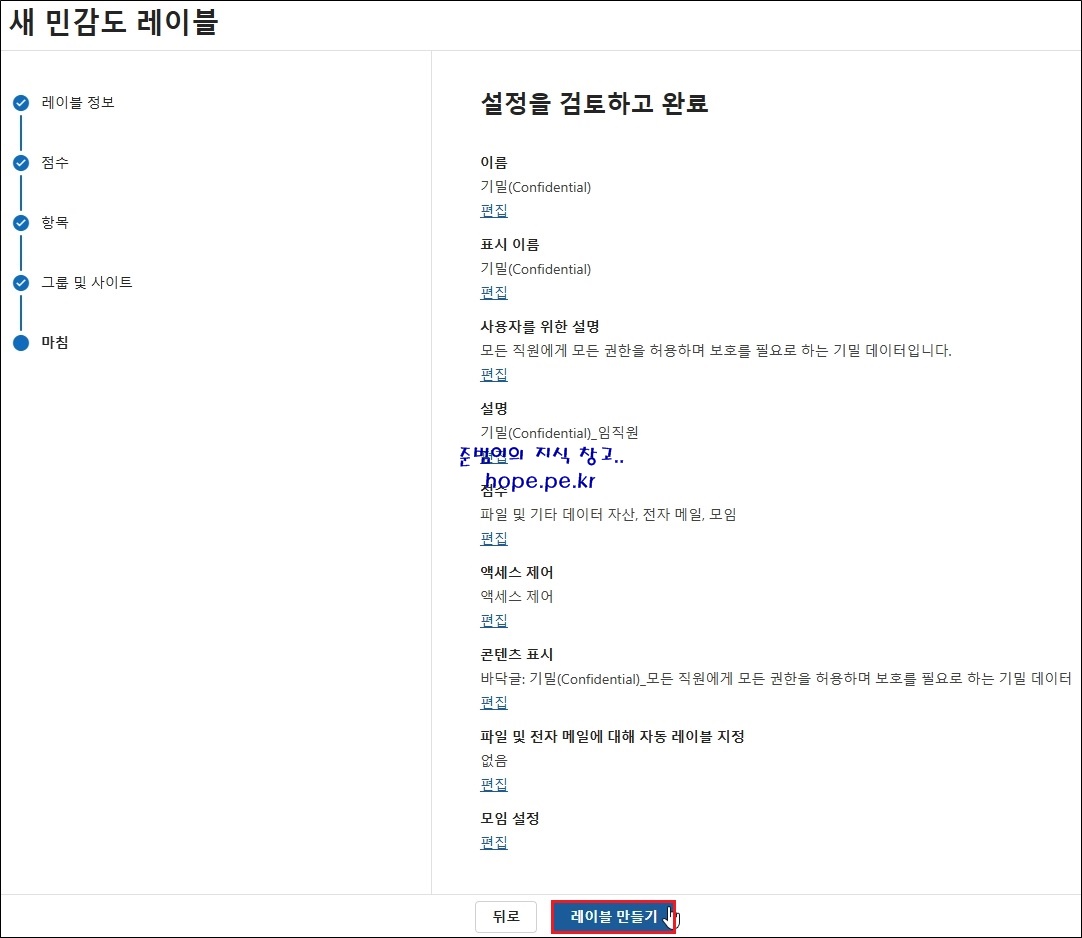 새 민감도 레이블 > 마침 > 설정을 검토하고 완료 화면에서, '레이블 만들기' 를 클릭 합니다.